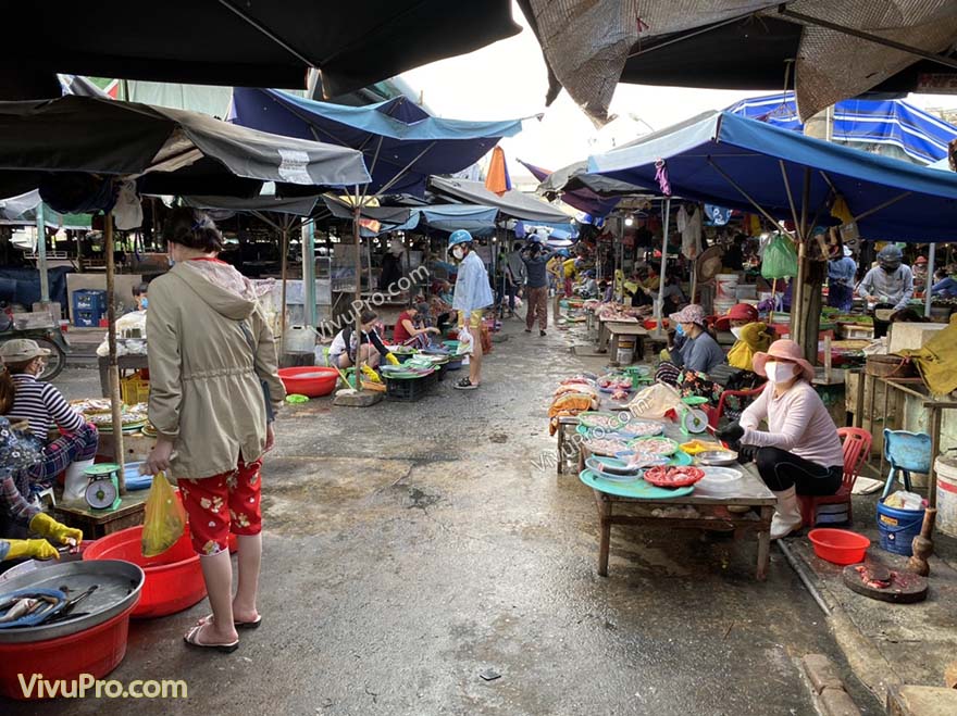 Chợ mở cửa cả ngày nhưng đông đúc và tấp nập nhất có lẽ là từ 2h chiều trở đi đến 6h chiều, chợ bán các mặt hàng đủ các loại cá biển, mực, ốc, tôm cua, cả tôm hùm tươi sống với giá chỉ 800k/ kg tôm hùm baby loại 2-3 con/kg còn sống nhảy đành đạch.